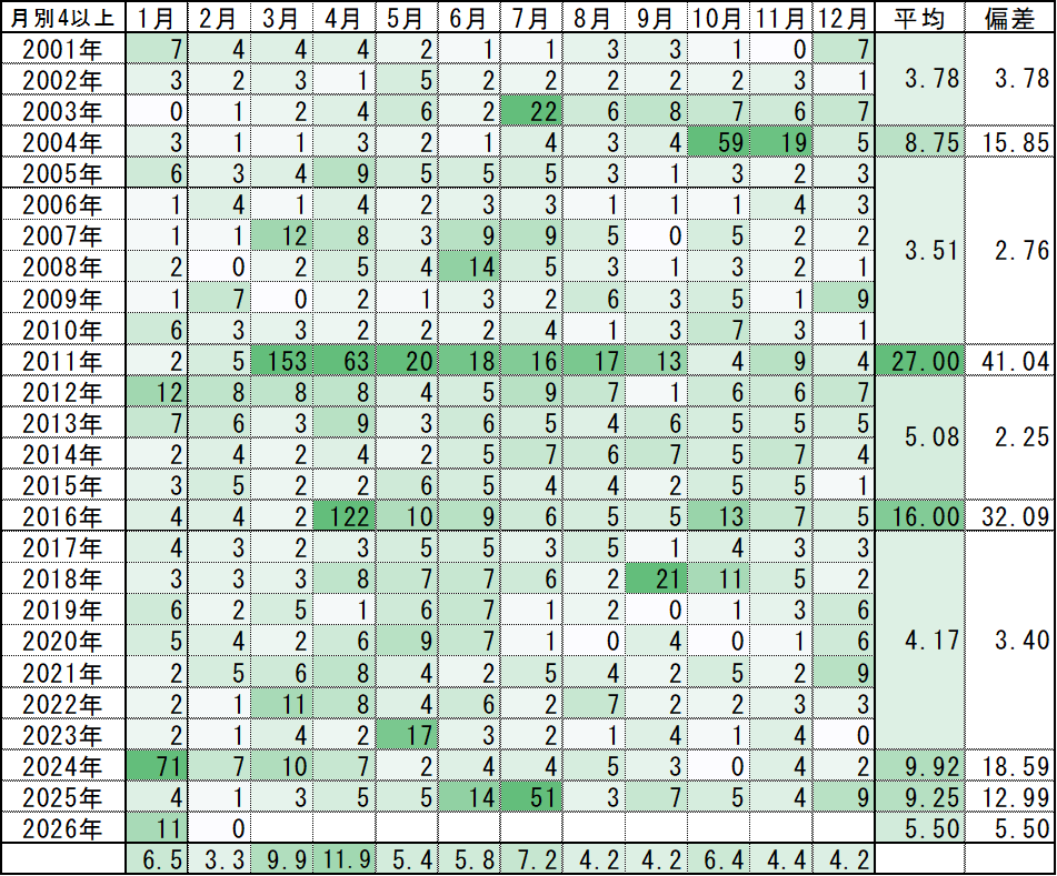 2001年以降の約四半世紀の月別回数を緑色をベースに表としてみました。時期によって大きな差があるため、地震活動が特に活発だった年を区別して右側に「平均・偏差」を表示してあります。
