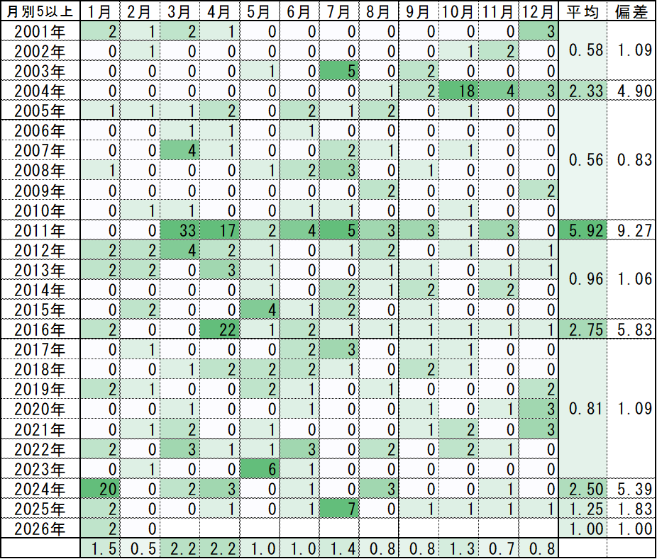 こうしてみると、月1回ペースでも年2桁となり、少なくともそれでも『少なくない』というのは意外に映るかも知れません。月平均1回も起きない年の方が多いのであって、仮に震度5以上が複数回あるような活発な地震活動があれば、より間隔は広がっていくこととなります。年ベースでは「年2桁」が一つの目安かも知れません。